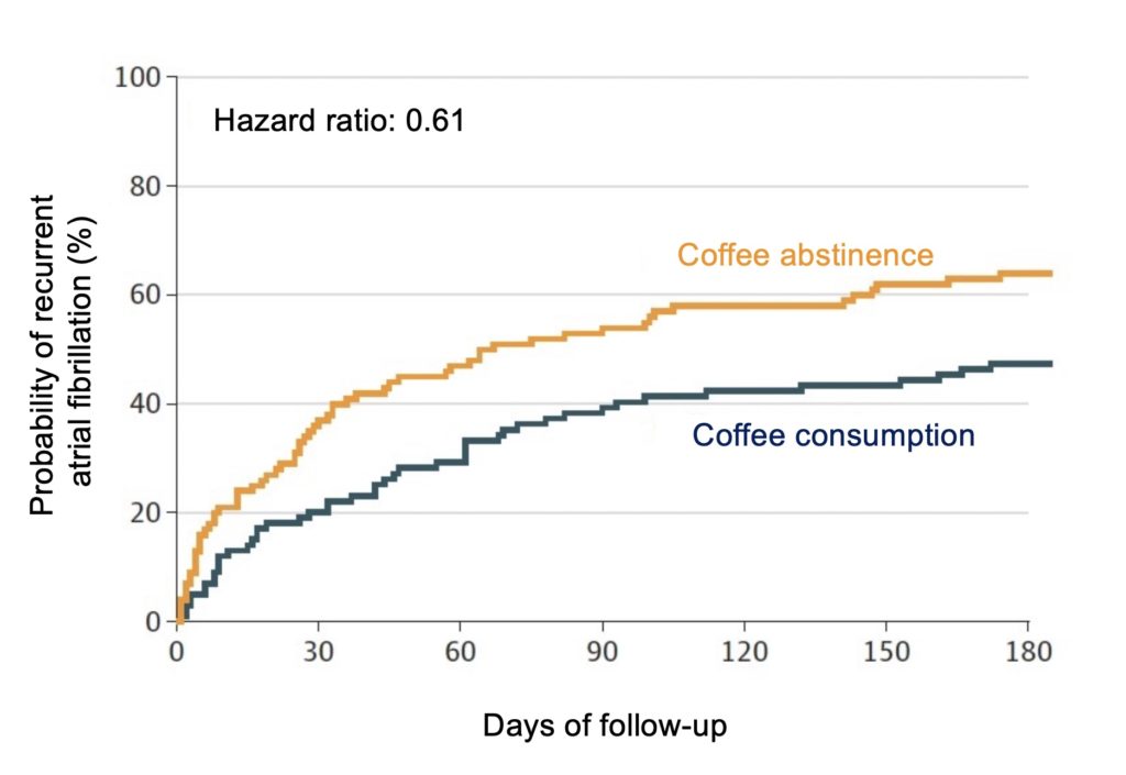 Figure 1. Probability of atrial fibrillation recurrence according to daily coffee intake. Note the longer time to recurrence for the coffee-consuming group compared to the abstinent group, resulting in a 39% reduction in the risk of atrial fibrillation recurrence (risk ratio = 0.61). AF = atrial fibrillation. Adapted from Wong et al. (2025).